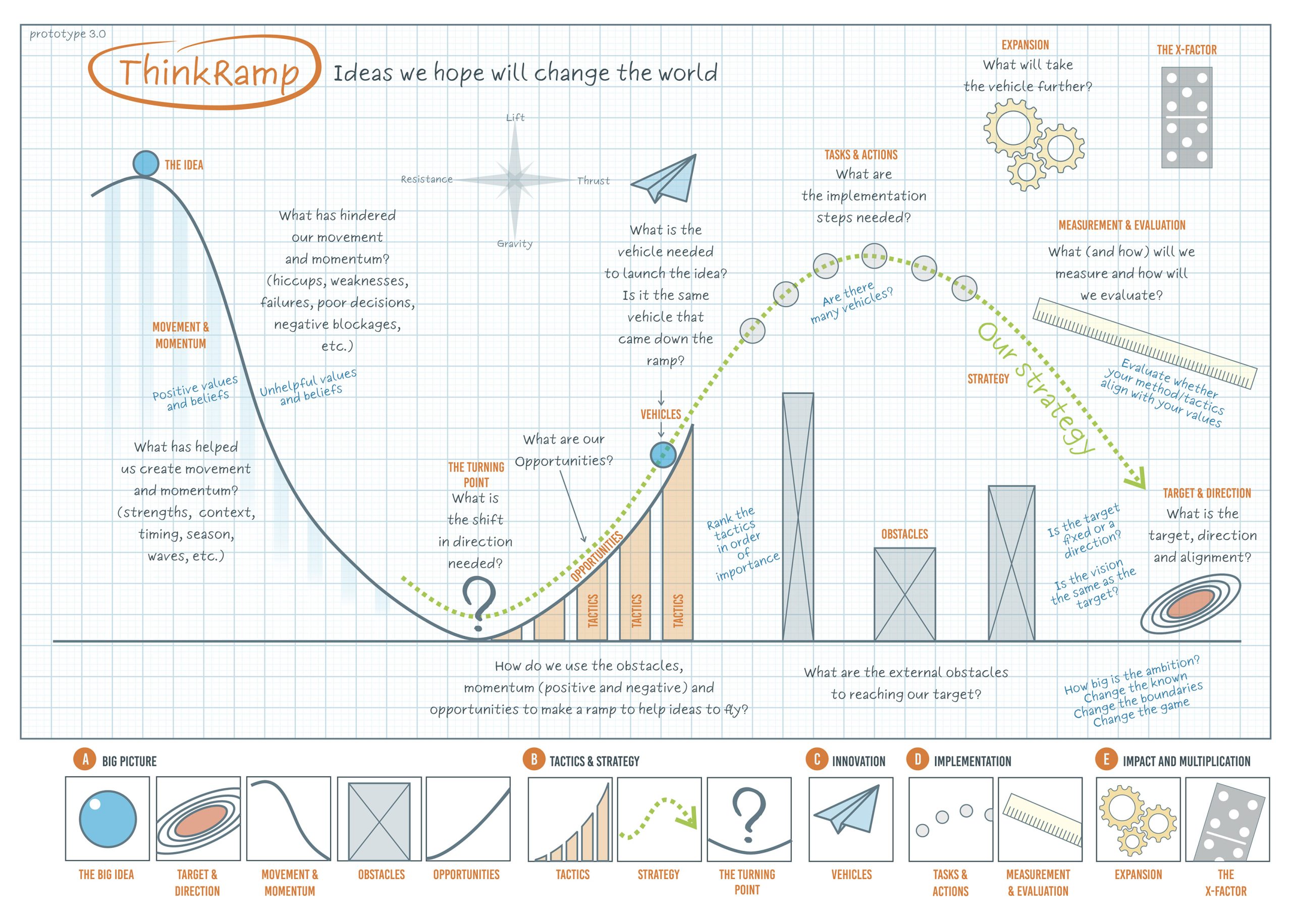 Asking a team to think strategically, creatively and practically all at once, will be hard for them. We easily get ‘stuck’ in our thinking. We find old solutions to familiar challenges. ThinkRamp attempts to help us to collaborate and think in fresh ways, knocking us out of our familiar patterns.